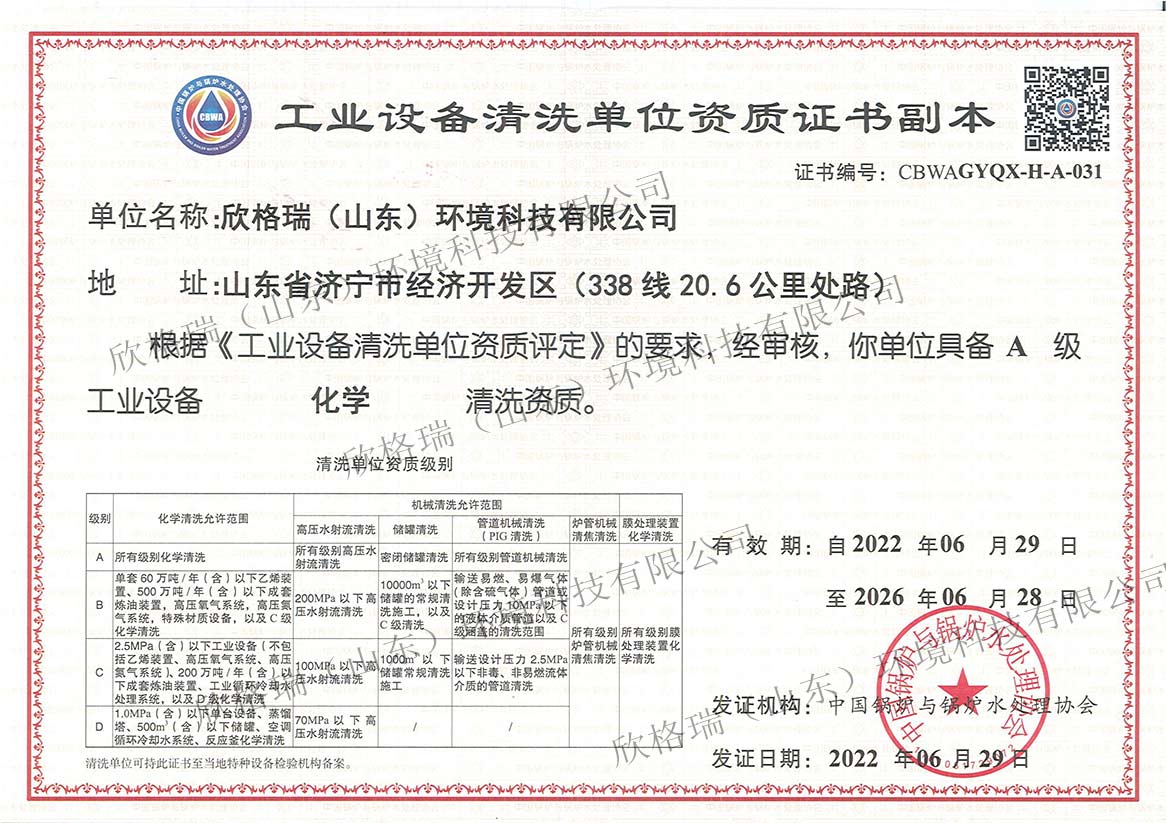 工業(yè)設(shè)備清洗單位能力證書(shū)(A級(jí)化學(xué)清洗)