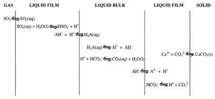 石灰石-石膏濕法煙氣脫硫系統(tǒng)中涉及以下三個(gè)過程:石灰石溶解,二氧化硫吸收,亞硫酸鹽氧化為硫酸鹽。所涉及到主要化學(xué)反應(yīng)式如下: